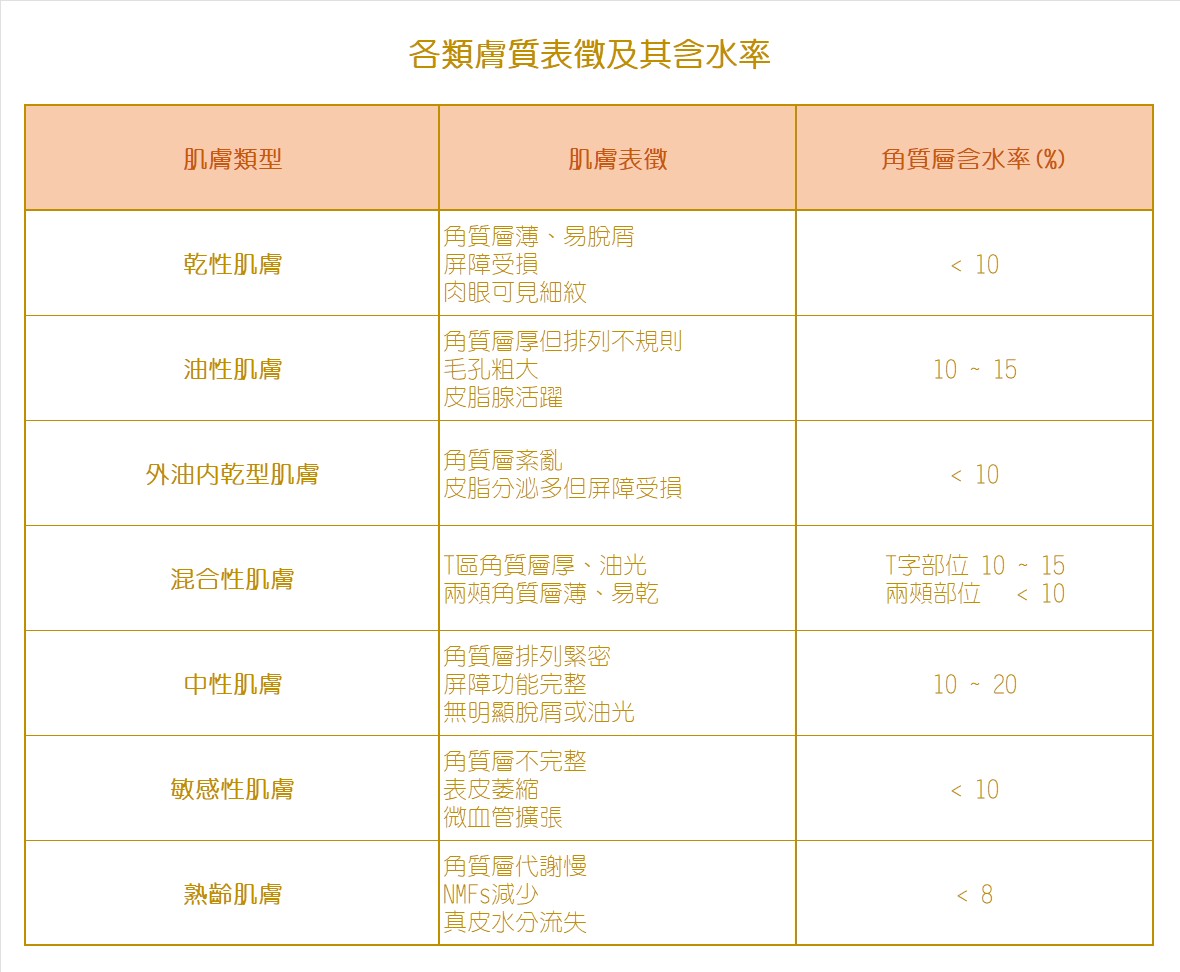 肌膚特徵: 皮膚油水平衡,角質層含水率達20-35%。