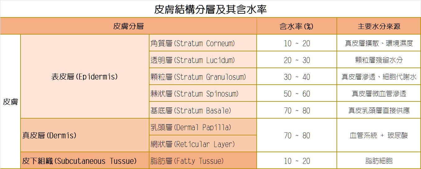 角質層的阻擋: 角質層位於肌膚的最外層,由角化細胞與脂質所構成。具有皮膚屏障的功能,可以有效防止水分散失,維持肌膚的含水量。