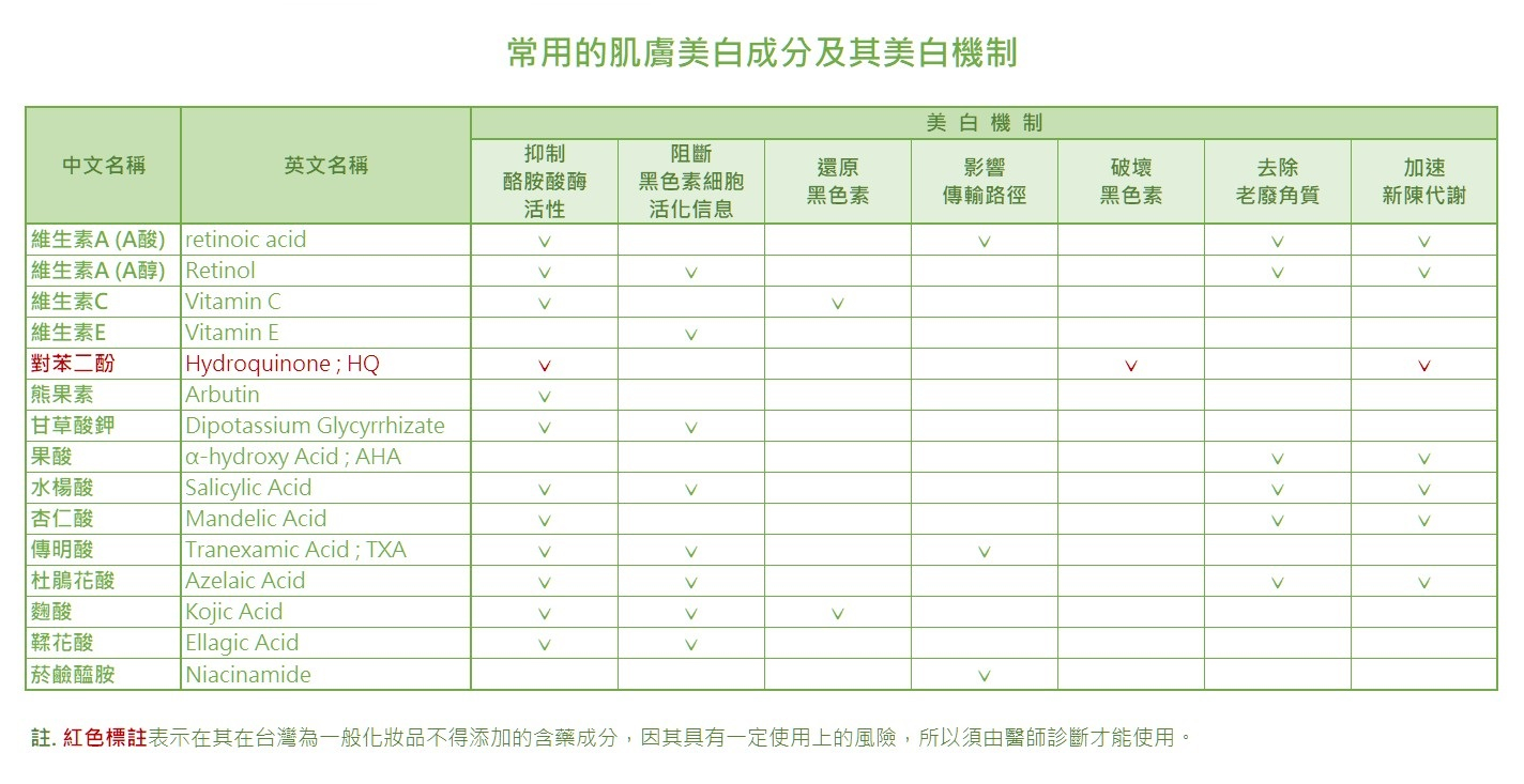 由這份列表可以看出,其實大部分的美白成分都不會只有單一種美白功能,成分的美白能力通常都是複合性的,主要功能之外通常還伴隨其次要功能,當然也有原本主要功能不是用做美白用途,但剛好發現它有美白功能的成分,不管是直接或間接美白 (例如傳明酸 Tranexamic Acid,本來主要在醫學上作為凝血劑用途)。 所有的美白成分其實都有其適用性及使用限制,因此唯有了解美白成分的特性才能更正確且有效地使用美白成分,讓美白成分的效果發揮到最大。