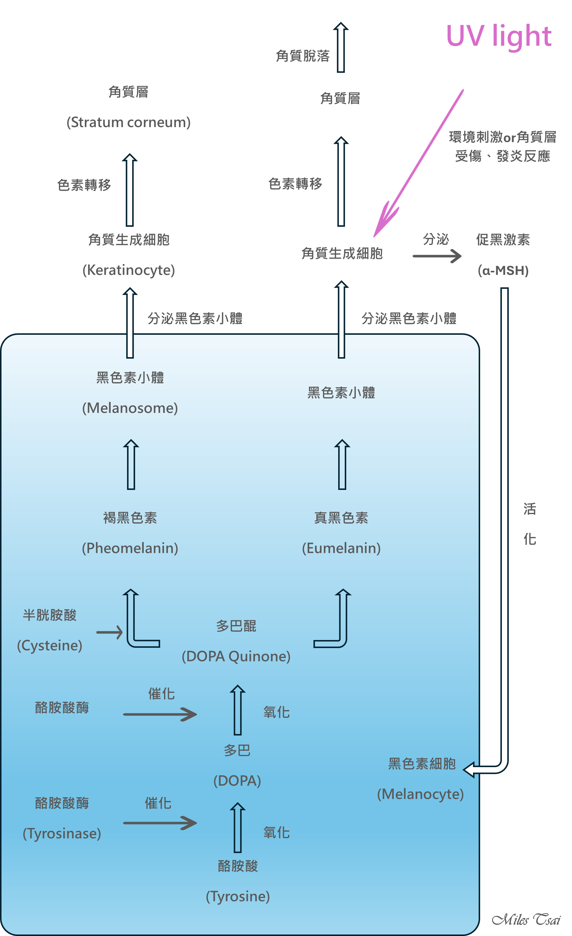 在這份黑色素形成及傳輸路徑圖裡還有許多細節尚未帶入或整不夠完整,例如一些在生成黑素的過程中具有導控或活化黑色素細胞的因子,例如促腎上腺皮質素的ACTH、性荷爾蒙的Estrogen、發炎反應與黑皮素受體MC1R…等等我們並沒有提到,這些物質或細胞反應對於黑色素的生成調控也具有影響力,但限於篇幅的問題,有機會我們會再為大家補充細說或提供新版的圖改給大家。